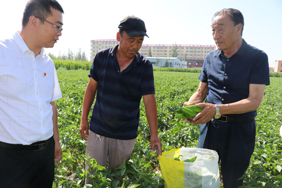 2020年7月,石光銀(右一)向十里沙村的貧困戶了解辣椒收成情況。攝影/王鑫