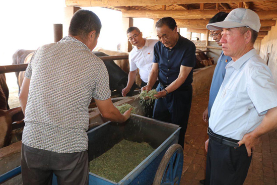 2020年7月,石光銀(右三)同十里沙村村干部一起,查看合作社養(yǎng)牛情況。攝影/王鑫