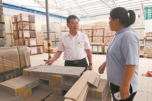 李久存(左)在村辦企業(yè)調(diào)研指導