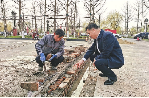 李久存(右)和施工人員交流村體育廣場提升改造中排水溝存在的問題
