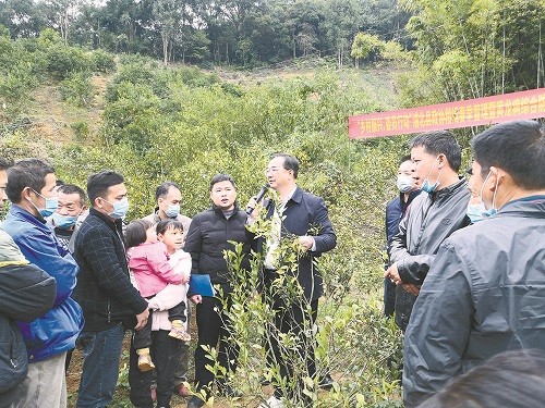 “黃龍病俗稱‘柑橘癌癥’,是一種危害性極大、毀滅性極強的傳染性病害,目前還沒有有效的治療藥劑,柑橘樹染病之后只能砍掉以免傳染健康樹……”2月14日,為搶抓農時助生產,充分發(fā)揮政協(xié)作用,廣西壯族自治區(qū)欽州市浦北縣政協(xié)按照“開年就開干,開局就決戰(zhàn)”的要求,迅速部署“鄉(xiāng)村振興 委員行動”活動,積極延伸協(xié)商觸角,推動服務下沉,在平睦鎮(zhèn)良村村的果園里開展“柑橘春季管理暨黃龍病綜合防控技術培訓”。圖為市政協(xié)副主席、農業(yè)技術專家李云昌就柑橘黃龍病防治為當?shù)胤N植戶授課。覃科棵 攝