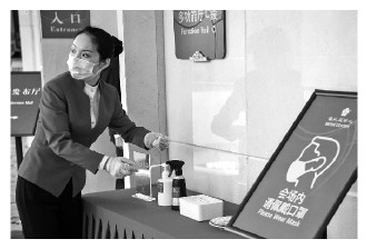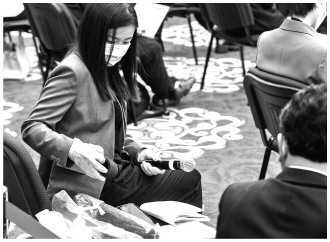 下圖 梅地亞兩會新聞中心分會場入口處為媒體記者準(zhǔn)備了口罩等防疫用品。