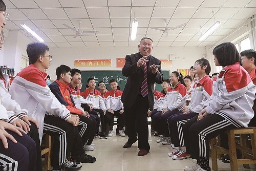 近日,山東省高密市政協(xié)開展“政協(xié)講堂進校園”活動,組織界別委員深入全市中小學(xué)校,為學(xué)生講解黨史知識,增進愛黨愛國愛家鄉(xiāng)的深厚情懷。圖為市政協(xié)委員、市曲藝團團長栗瑞杰為高密二中的學(xué)生表演快書自編曲目《百年風(fēng)雨話滄桑》。 李淼 攝