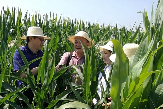 彭緒冰(左一)指導(dǎo)玉米科研工作