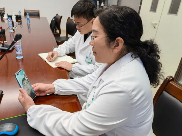全國人大代表、南昌大學第一附屬醫(yī)院院長張偉為患者進行遠距離視頻問診。(江西省人大常委會供圖)