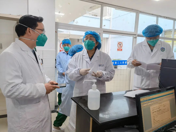 全國人大代表、南昌大學第一附屬醫(yī)院院長張偉(右二)在上饒市第二人民醫(yī)院隔離病房參與患者救治。(江西省人大常委會供圖)