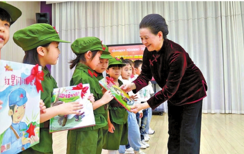 郭建華走進(jìn)開封市金明幼兒園,向孩子們贈(zèng)送圖書。
