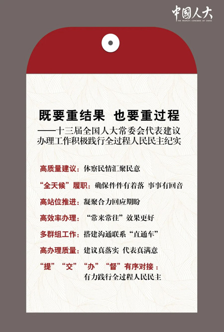 代表建議工作是一個(gè)點(diǎn),由點(diǎn)及面,我們看到,十三屆全國人大常委會充分發(fā)揮人大代表作用,讓民情民意民智貫穿代表工作“全過程”,使人大代表工作建立在更加堅(jiān)實(shí)的民意基礎(chǔ)之上,努力做到民有所呼、我有所應(yīng),在代表依法履職中有力踐行全過程人民民主,使發(fā)揮代表作用成為人民當(dāng)家作主的重要體現(xiàn)。