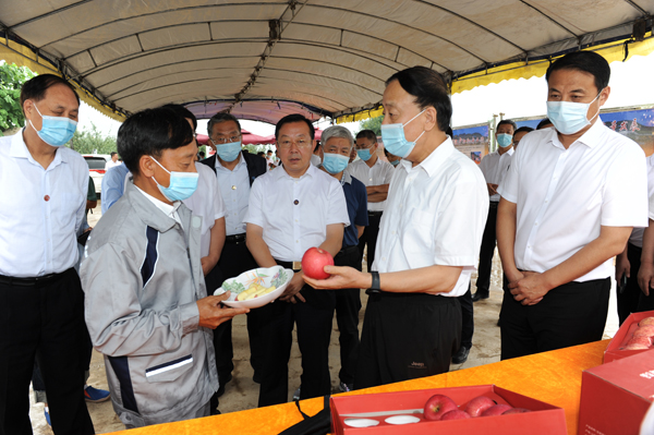 7月8日至13日,全國(guó)人大常委會(huì)副委員長(zhǎng)、九三學(xué)社中央主席武維華率執(zhí)法檢查組就貫徹實(shí)施《中華人民共和國(guó)鄉(xiāng)村振興促進(jìn)法》情況在山西省開(kāi)展執(zhí)法檢查。圖為武維華副委員長(zhǎng)檢查吉縣吉昌鎮(zhèn)橋南村果園標(biāo)準(zhǔn)化建設(shè)情況。?攝影?梁志強(qiáng)
