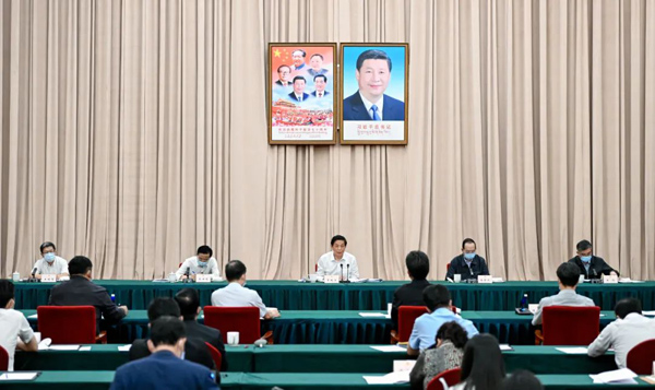 7月12日至15日,中共中央政治局常委、全國(guó)人大常委會(huì)委員長(zhǎng)栗戰(zhàn)書率隊(duì)赴西藏就青藏高原生態(tài)保護(hù)立法進(jìn)行調(diào)研。這是7月14日下午,栗戰(zhàn)書在拉薩主持召開(kāi)立法座談會(huì)并講話。攝影/新華社記者?翟健嵐