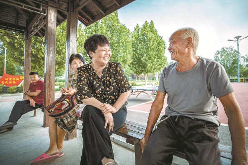 葛樹芹(右二)和村民在村中心公園里拉家常。孫瑩?攝