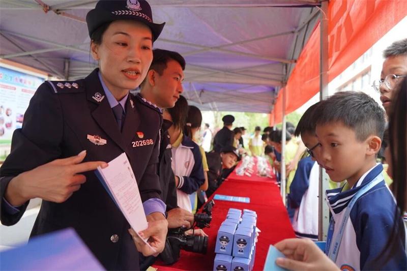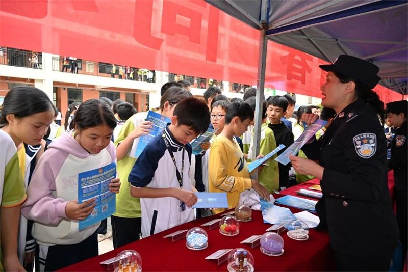 課室外,多部門(mén)聯(lián)合打造的“法治移動(dòng)課堂”同步鋪開(kāi),形成全方位普法矩陣。在仿真毒品展示區(qū),禁毒民警結(jié)合新型毒品模型,揭露“跳跳糖”“奶茶粉”等偽裝手段,深刻警示學(xué)生警惕“第一口”誘惑;交警部門(mén)將流動(dòng)宣傳車(chē)開(kāi)進(jìn)操場(chǎng),循環(huán)播放本地交通事故警示片,血淋淋的案例讓圍觀(guān)學(xué)生直呼“安全帶就是生命帶”。