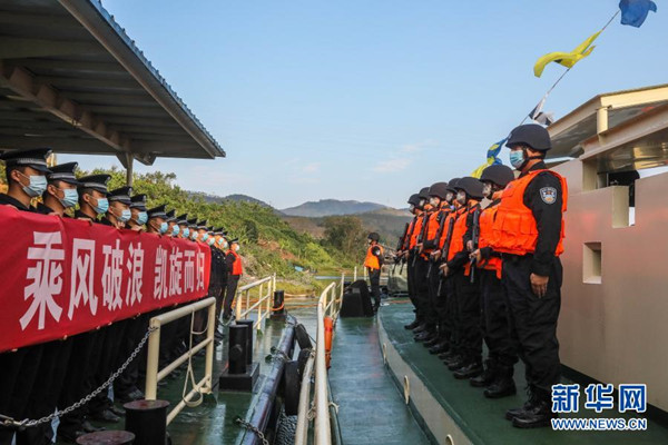 2月23日,參巡隊員在執(zhí)法艇上列隊站坡與岸上歡送的民警告別。 新華社發(fā)(趙越 攝)