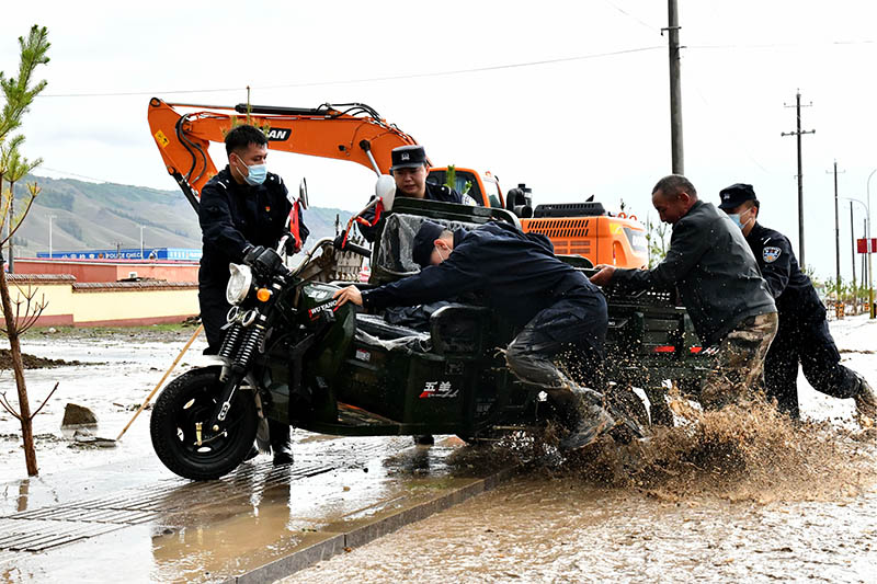 7月15日,新疆哈密市伊吾縣前山鄉(xiāng)出現(xiàn)雷雨天氣,隨后突降暴雨,17時(shí)10分許,由于降水量逐漸增大引發(fā)洪水,駐守在哈密市伊吾縣前山鄉(xiāng)的哈密邊境管理支隊(duì)伊吾邊境管理大隊(duì)前山邊境派出所立即啟動(dòng)突發(fā)情況緊急預(yù)案,聯(lián)合當(dāng)?shù)剜l(xiāng)政府出動(dòng)9名民警,6名輔警和15名護(hù)邊員組成“黨員突擊隊(duì)”,攜帶救援工具趕往受災(zāi)嚴(yán)重的前山鄉(xiāng)中心村開(kāi)展救援。