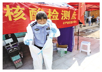 圖④ 民警在中風(fēng)險地區(qū)執(zhí)勤時,抽空解開防護(hù)服,抖落身上的汗水。