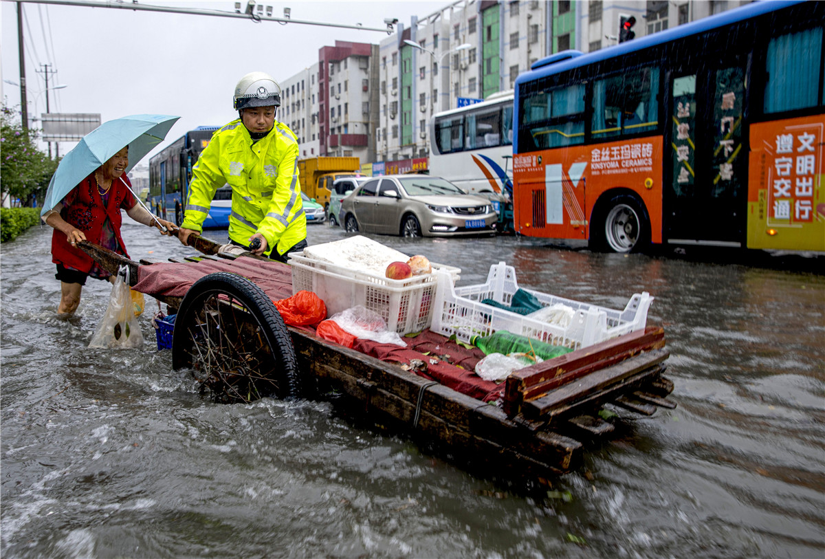 8月12日,安徽省合肥市廬江縣城,民警正在護送群眾安全通過積水路段。當日,廬江縣境內(nèi)突降暴雨,極端天氣造成城區(qū)地勢較低的路段出現(xiàn)積水,給百姓出行造成不便。廬江縣公安局交通警察聞汛而動,在傾盆大雨中指揮交通,幫助過往群眾,保障道路安全暢通。