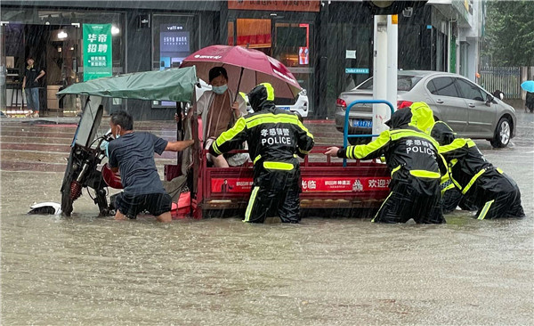 8月12日,孝感城區(qū)多條道路積水嚴(yán)重。孝感公安交警立即轉(zhuǎn)為“多功能服務(wù)隊(duì)”,開展路面巡控、疏導(dǎo)和救援。