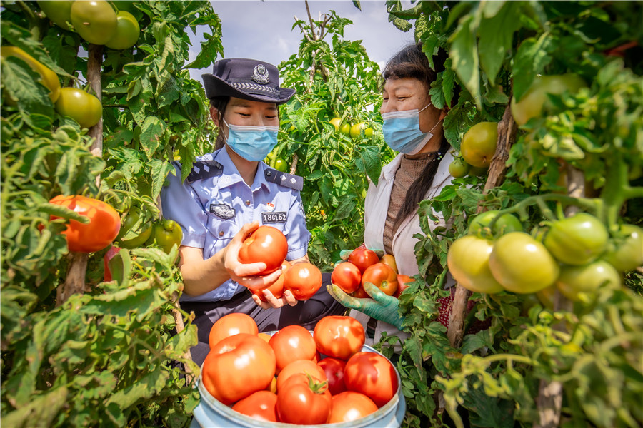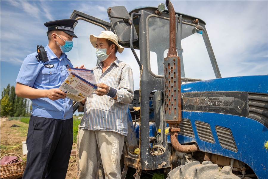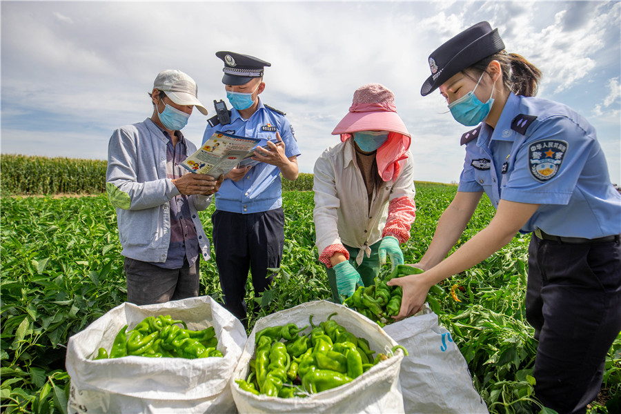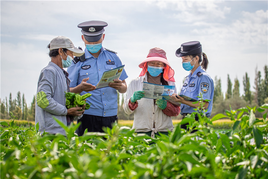 圖為8月25日,民警在轄區(qū)博樂(lè)市小營(yíng)盤鎮(zhèn)多蘭特布拉格村與秋收群眾一起,一邊干農(nóng)活、一邊宣傳法律。
