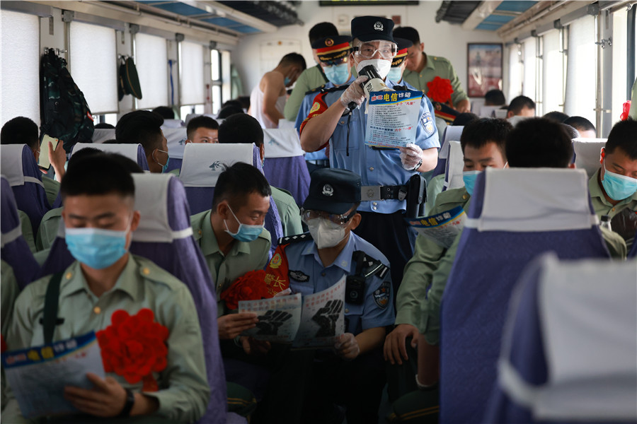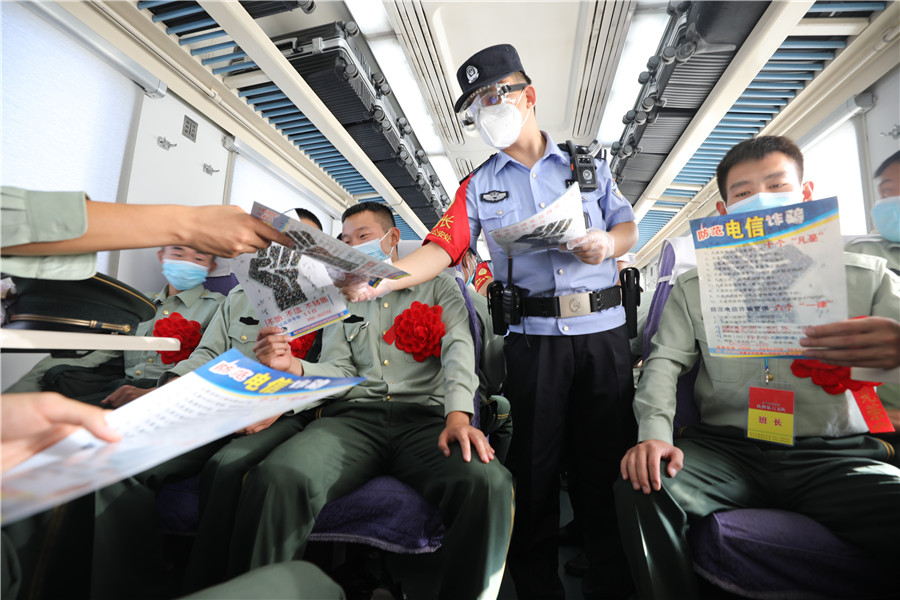 9月1日,由喀什開往西安的T270次列車,迎來一批退伍士兵旅客,烏魯木齊鐵路公安局庫爾勒公安處乘警支隊值乘民警在做好列車值乘工作的同時,向退伍士兵開展了防范電信網絡詐騙法治宣講,切實保障退伍士兵安全歸鄉(xiāng)。