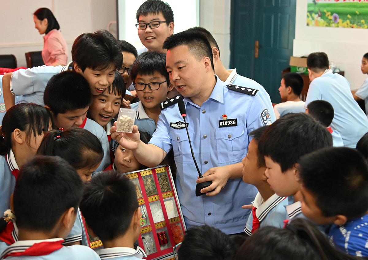 6月21日,安徽省蕪湖市公安局鏡湖分局荊方派出所聯(lián)合轄區(qū)街道組織開展以“禁毒記心間,人生不‘毒’行”為主題的禁毒宣傳進(jìn)校園活動。民警和街道工作人員來到方村小學(xué),采取講座、識別毒品種類、有獎問答、禁毒簽名等方式,讓學(xué)生們從小樹立禁毒意識。