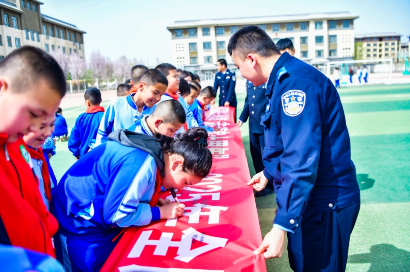 圖為民警組織學生在“全民國家安全教育 走深走實十周年”橫幅上簽名。