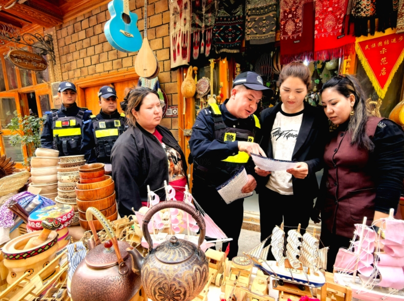 圖為和田市公安局團(tuán)城便民警務(wù)站民輔警在團(tuán)城景區(qū)向游客和景區(qū)商戶開展防范電信網(wǎng)絡(luò)詐騙普法宣傳活動(dòng)。