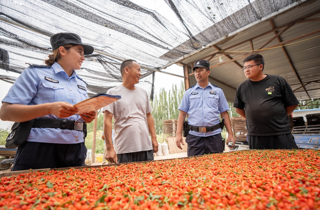 新疆葉城縣江格勒斯鄉(xiāng)的百畝枸杞田碩果滿枝,一串串紅潤的枸杞掛滿枝頭,格外誘人。7月15日,葉城縣公安局結合轄區(qū)實際,采取有效措施,把警務工作融入鄉(xiāng)村振興,深耕“民生警務”“服務警務”,以保農(nóng)、護農(nóng)、利農(nóng)為目標,主動開展治安巡邏、交通管理、安全宣傳、防火及服務群眾等工作,全方位、多渠道為枸杞采摘保駕護航。
