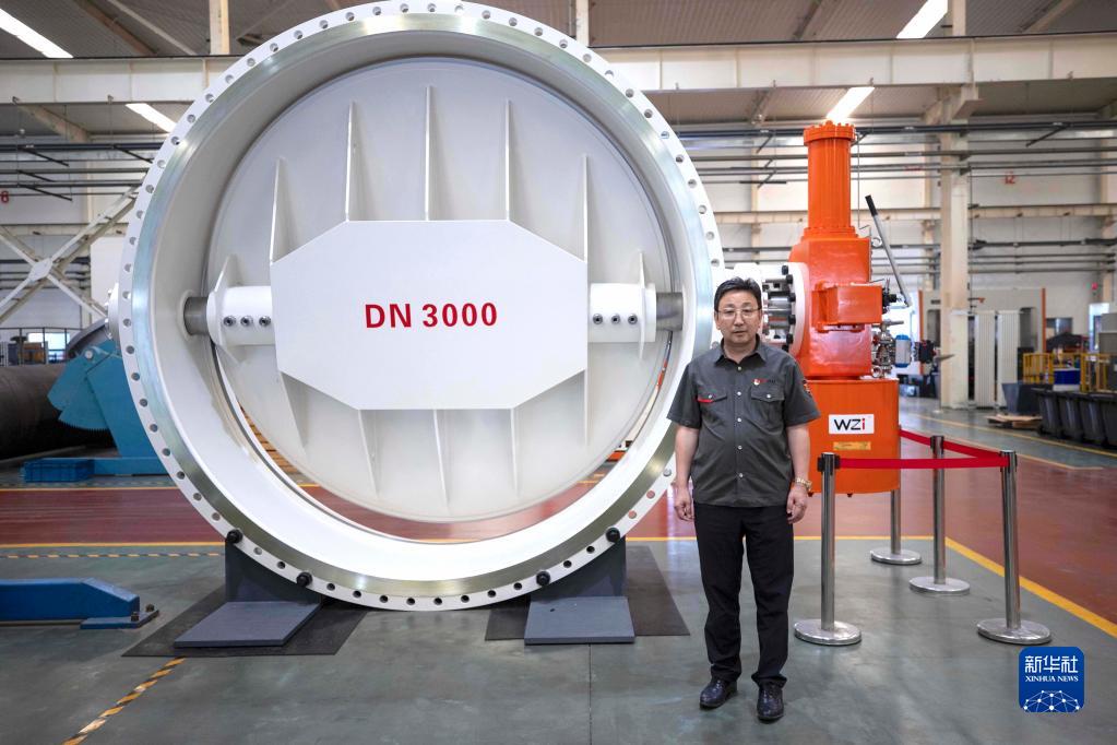 馬玉山在位于寧夏吳忠市的吳忠儀表有限責(zé)任公司自動化產(chǎn)業(yè)園數(shù)字化裝配車間中,左側(cè)為該公司生產(chǎn)的DN3000三偏心蝶閥(9月12日攝)。 新華社記者 楊植森 攝