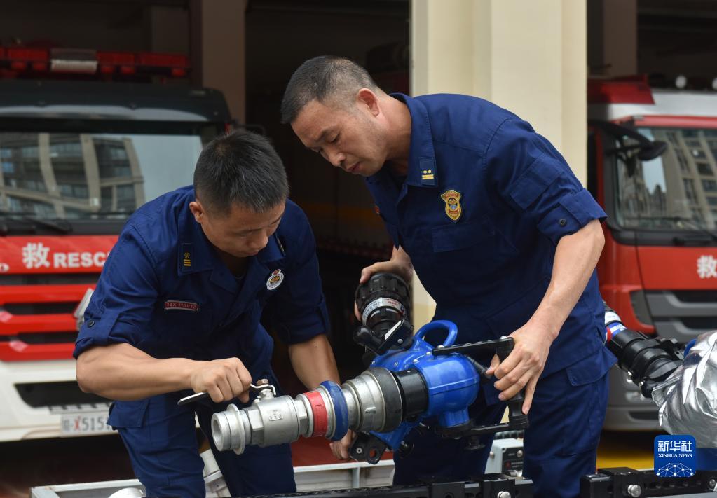在江西省南昌市消防救援支隊特勤大隊營院內(nèi),李勝利(右)在檢查裝備器材(2020?年10月8日攝)。新華社發(fā)(熊超 攝)