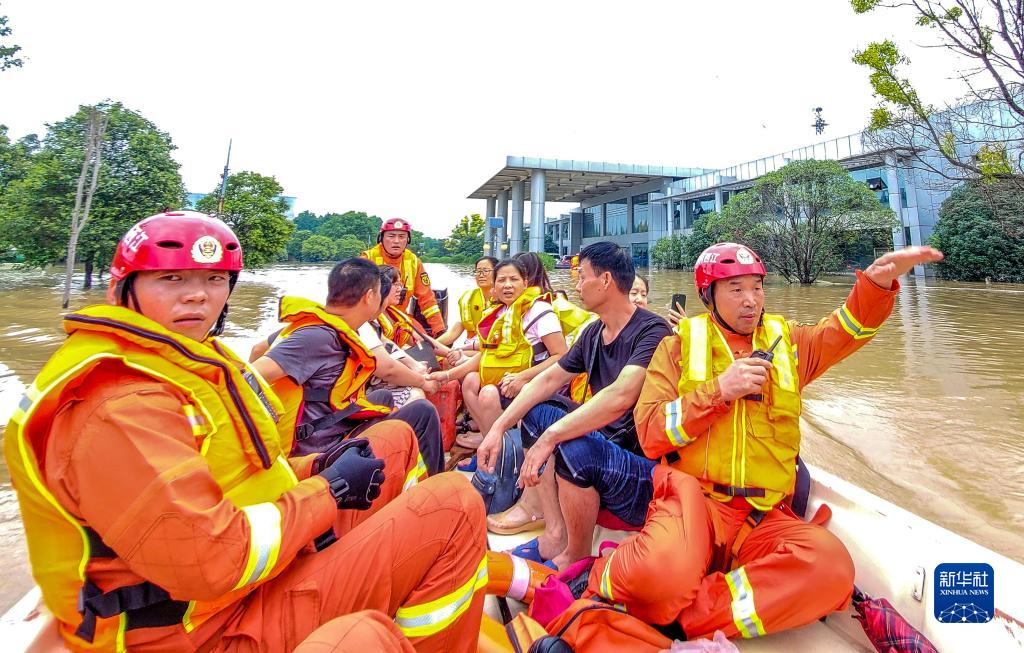 在河南省鄭州市中牟縣,李勝利(左一)在疏散被困群眾(2021年7月19日攝)。新華社發(fā)(田聰 攝)