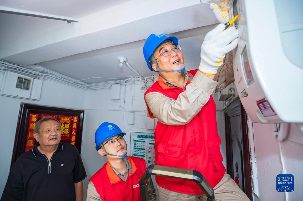 張黎明(右)帶領(lǐng)國網(wǎng)天津濱海黎明共產(chǎn)黨員服務(wù)隊到天津市濱海新區(qū)丹東里小區(qū)為居民查看電表(2022年7月15日攝)。新華社發(fā)(李津攝)