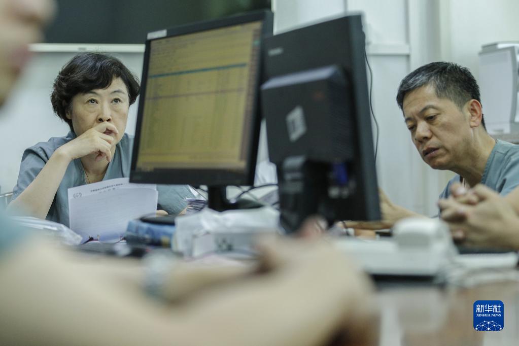 錢(qián)素云(左)在辦公室參加病例討論(2019年7月31日攝)。新華社記者 才揚(yáng) 攝