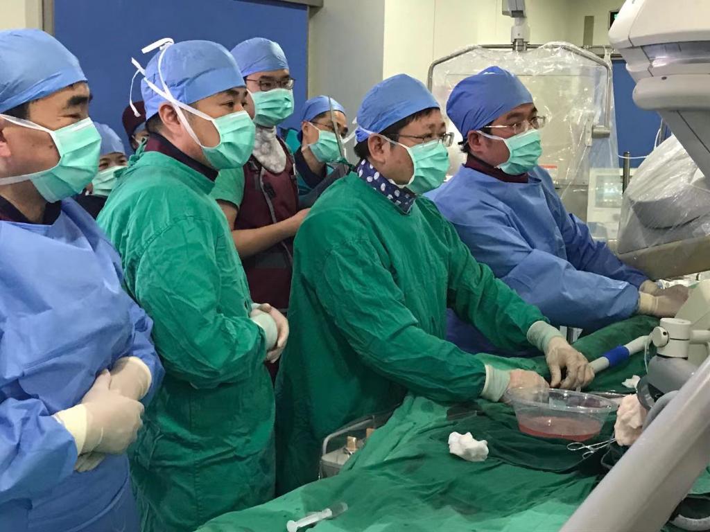 圖為潘文志(右一)及其團(tuán)隊正在實施經(jīng)導(dǎo)管瓣膜介入手術(shù)。