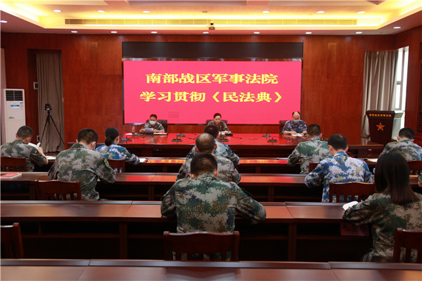 南部戰(zhàn)區(qū)軍事法院召開專題黨委會,認真學(xué)習(xí)習(xí)近平主席在中央政治局第二十次集體學(xué)習(xí)時的重要講話、全國法院學(xué)習(xí)貫徹2020年全國兩會精神視頻會議精神和民法典,專題部署推動戰(zhàn)區(qū)兩級軍事法院和轄區(qū)部隊民法典學(xué)習(xí)宣傳貫徹工作,要求戰(zhàn)區(qū)兩級軍事法院在學(xué)習(xí)宣傳貫徹民法典中走在前列,為部隊和官兵樹好標桿;準確理解和把握民法典立法精神、條文含義和最新內(nèi)容,提高運用民法典維護官兵權(quán)益、化解矛盾糾紛、促進部隊和社會和諧穩(wěn)定的能力;把深入宣傳貫徹民法典作為當前和今后一個時期的工作重點,在戰(zhàn)區(qū)部隊營造尊法學(xué)法守法用法的濃厚氛圍。