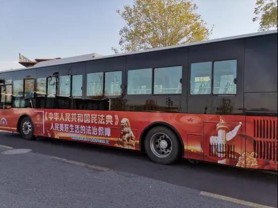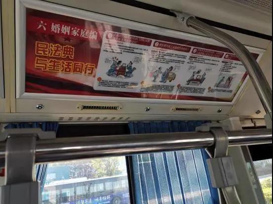 在宣傳《民法典》公交車車體內(nèi)外,精心營造學習宣傳《民法典》的濃厚氛圍,將《民法典》公交專線主題設(shè)計為“《民法典》與生活同行”,車體以紅色為主基調(diào),圖文并茂,視覺沖擊力強。車內(nèi)兩側(cè)、坐椅靠背、車廂展板等位置進行了全方位包裝,車內(nèi)移動電視持續(xù)播放《民法典》宣傳短視頻,展示《民法典》中見義勇為免責、小區(qū)共有場地收入歸業(yè)主、夫妻共同債務如何界定等與百姓生活息息相關(guān)的法條。乘客在乘車的同時,可以感受到學習《民法典》的樂趣和必要性。