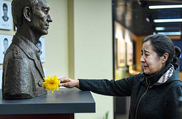 2021年4月3日,在新疆警史館,瑪依努爾在愛(ài)人艾熱提的雕像前擺上菊花。新華社記者 王菲 攝
