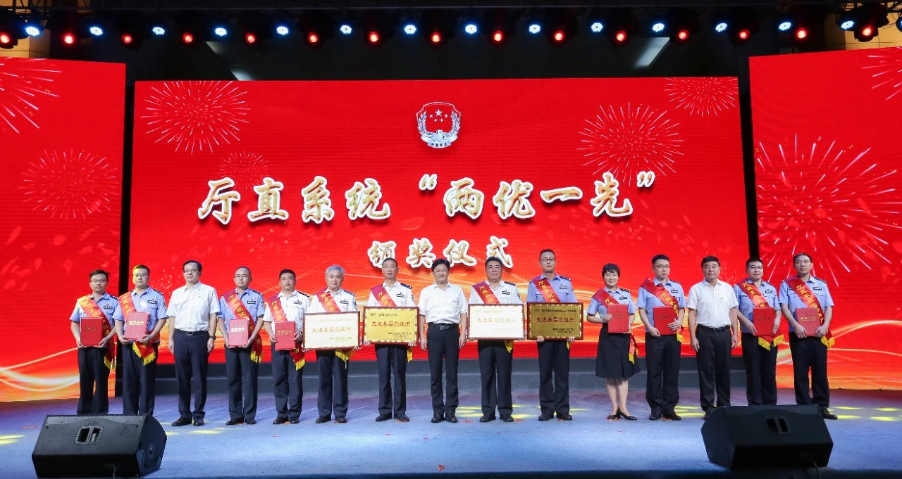 ▲江西省司法廳領(lǐng)導(dǎo)江濤、劉品韜、邱榮飛、龔河興、胡興平、胡水明、鄧奕強、閻循店、劉晨華為廳機關(guān)“兩優(yōu)一先”代表頒獎