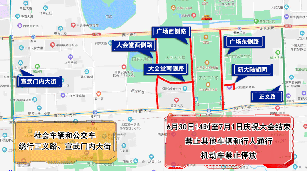 6月30日14時至7月1日慶祝大會結束,人民大會堂西側路、人民大會堂南側路、天安門廣場東側路、天安門廣場西側路、新大陸胡同,除持有慶祝大會專用證件的車輛和人員外,禁止其他車輛和行人通行,機動車禁止停放。社會車輛和公交車經(jīng)正義路、宣武門內大街繞行。