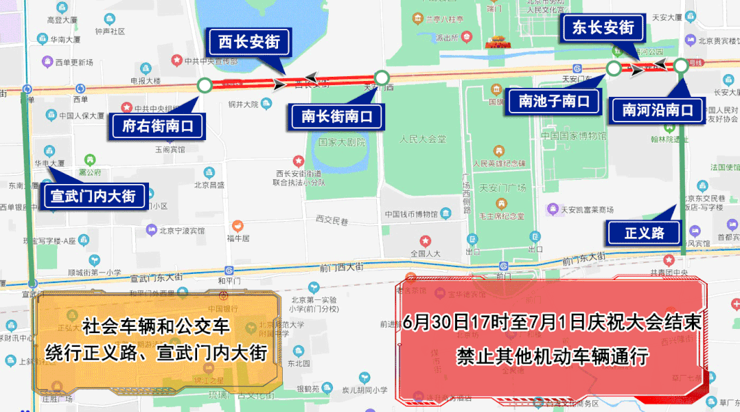 6月30日17時至7月1日慶祝大會結束,長安街由南長街南口(不含)至南池子南口(不含)雙方向路段,除持有慶祝大會專用證件的車輛和人員外,禁止其他車輛和行人通行。