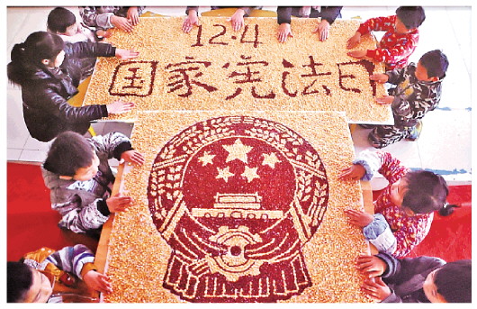 為了增強全社會的憲法意識,弘揚憲法精神,加強憲法實施,全面推進依法治國,2014年11月,全國人大常委會作出決定將12月4日設立為國家憲法日。圖為2014年12月,山東省沂源縣小朋友用玉米、紅小豆等作物制作出各種法治宣傳畫,迎接首個“國家憲法日”。 (資料圖片)