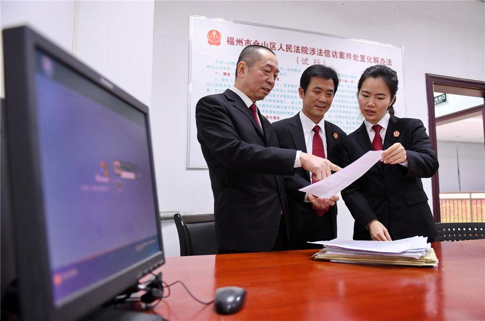 福建省福州市倉山區(qū)人民法院工作人員李揚(yáng)(右)和同事在研究處理12368訴訟服務(wù)熱線的群眾意見(2019年1月17日攝)。服務(wù)熱線主要負(fù)責(zé)法律咨詢、案件查詢、聯(lián)系法官、收集意見建議等,為人民群眾提供精準(zhǔn)、便捷的服務(wù)。新華社記者 林善傳 攝
