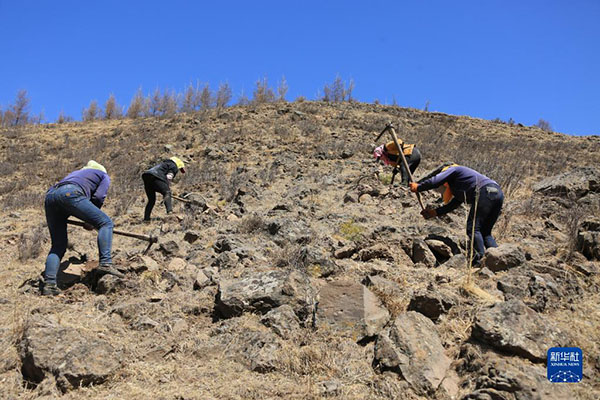 塞罕壩機械林場工人在石質(zhì)陽坡上造林(2016年4月13日攝)。新華社發(fā)