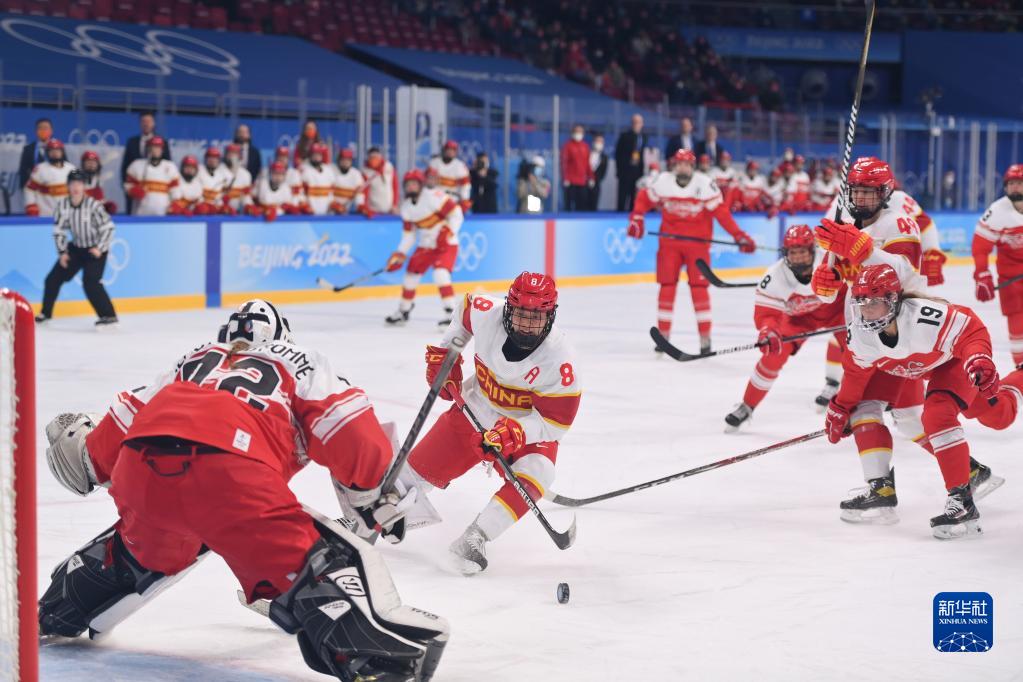2月4日,中國(guó)隊(duì)球員林綺琪(中)在比賽中進(jìn)攻。當(dāng)日,在五棵松體育中心舉行的北京冬奧會(huì)女子冰球小組賽中,中國(guó)隊(duì)以3比1戰(zhàn)勝丹麥隊(duì)。新華社記者 薛宇舸 攝