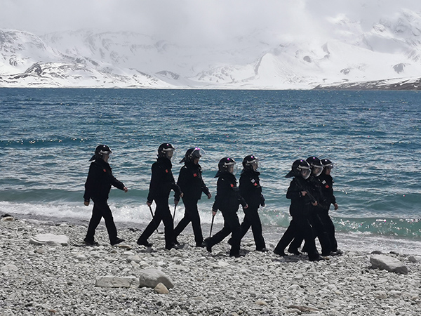 在20公分深的積雪地里,呂加駿深一腳淺一腳地前行,“小心腳下,這雪山下面有暗冰,別滑倒了”。呂加駿叮囑著身后的尼瑪頓珠,巡邏路是繞山體修建的上坡路,勉強能夠通行一輛車,靠山體的一側(cè)時不時滾落下零零散散的石頭,而另一邊就是懸崖峭壁,海拔近5000米的冰雪巡邏路上,不斷消耗著大家的體力,雙腳像被系上了幾十斤的重的大鐵鏈。寒冷而又稀薄的空氣吸入后,不斷刺激著肺部,呂加駿的胸口隱隱作痛,臉頰被凍得通紅,防寒帽的外檐早已結(jié)上了一層厚厚的沙冰。大家的喘氣聲越來越急促,踩在碎石雪上的吱呀聲越來越緩慢。