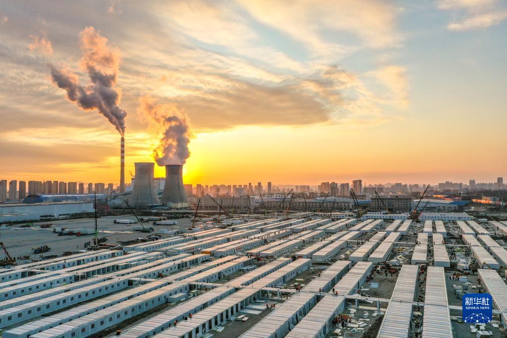 這是3月20日傍晚拍攝的吉林市高新南區(qū)隔離方艙建設(shè)現(xiàn)場(chǎng)(無(wú)人機(jī)照片)。新華社記者 張楠 攝