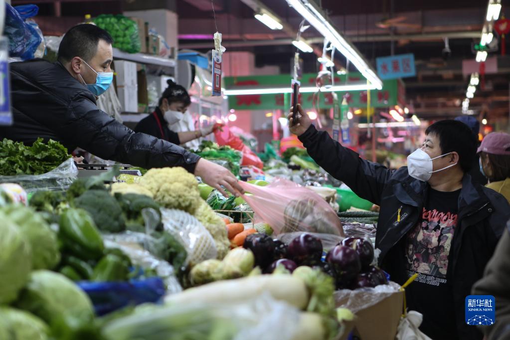 3月25日,在遼寧省沈陽(yáng)市鳳祥綜合市場(chǎng),一名市民買(mǎi)菜后掃碼付款。新華社記者 王乙杰 攝