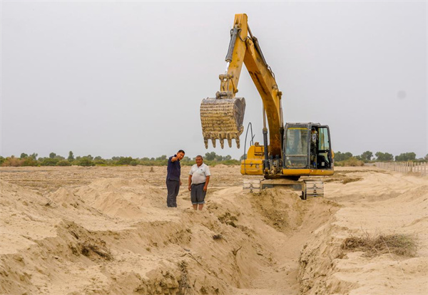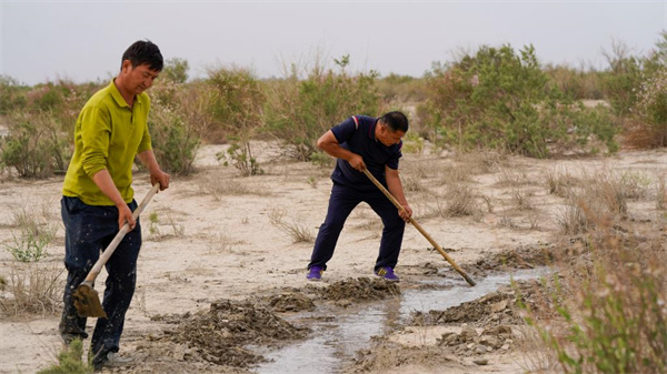 6月20日,艾力·尼亞孜(右)和護林員們一起挖渠引水。