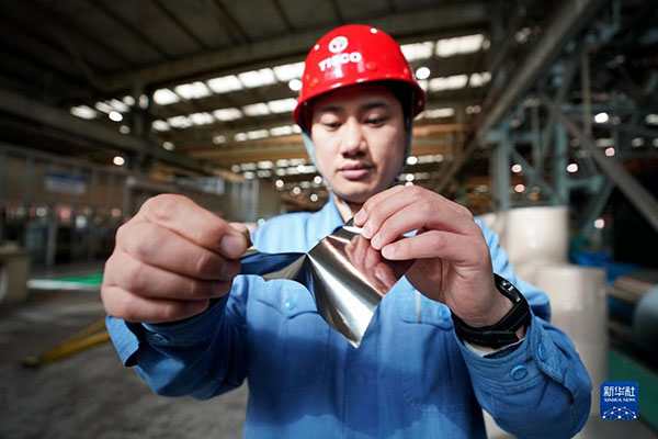 在中國寶武太鋼不銹鋼精密帶鋼有限公司,一名工作人員展示用手撕開超薄精密不銹帶鋼(2022年3月31日攝)。新華社記者 詹彥 攝