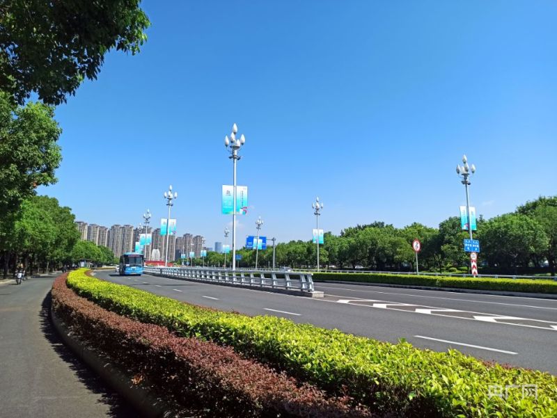 道路兩側以峰會為主題的道旗迎風而立(央廣網(wǎng)記者 羅曉英 攝)
