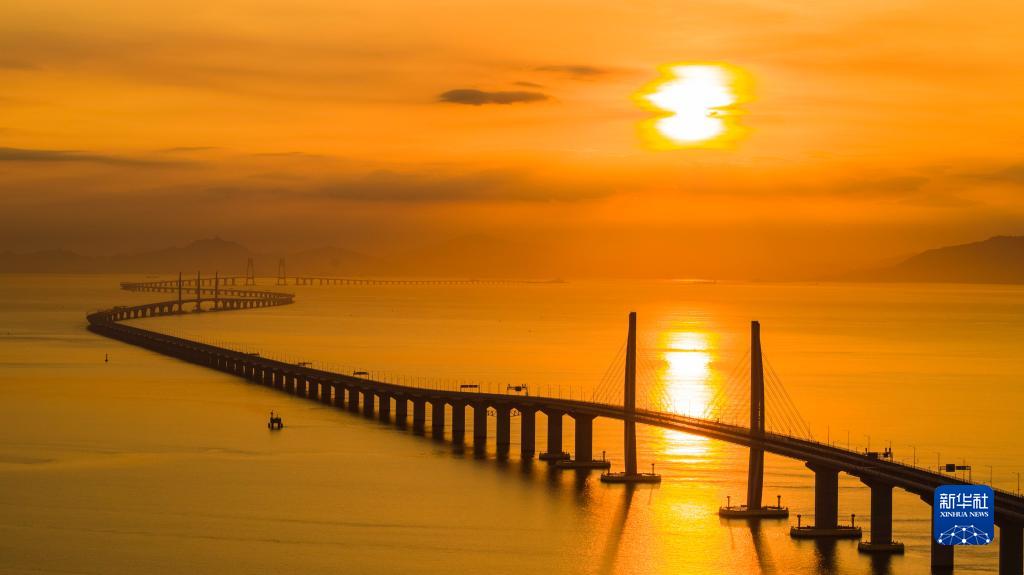 港珠澳大橋海上日出(2019年8月7日攝,無人機(jī)照片)。新華社發(fā)